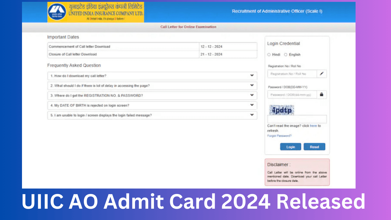 The United India Insurance Company (UIIC) has officially released the admit card for the Administrative Officer (AO) written examination. Candidates appearing for the exam, scheduled for 21 December 2024, can now download their hall tickets from the official website, uiic.co.in.